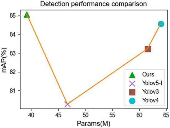 Figure 1 clearly demonstrates the superiority of our model in terms of the number of network parameters and the average detection degree. Our algorithm achieved the highest detection accuracy with the lowest amount of network parameters, and has a good application prospect.