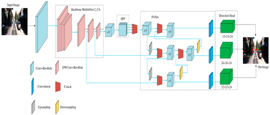 To achieve a lightweight object detection network with high precision and speed for object detection, a lightweight network model based on MobileNetv2_CA was proposed. The overall structure of the network model is shown in Figure 2. First, the improved lightweight Mobilenetv2 [17] network was used as the backbone feature extraction network for preliminary feature extraction, and the coordinated attention mechanism (CA) [18] was embedded to adaptively extract the channel relationships and location information to enrich feature extraction. Then, features at different scales were used as inputs for maximum pooling at different scales in the SPP [19] module to isolate significant contextual features, and the features were fed into the PANet [20] network for further enhanced feature extraction and multi-scale fusion. Finally, the three enhanced feature layers that were processed by, and input into, several convolutions were processed by 3 × 3 convolutional feature integration and 1 × 1 convolutional adjustment of the number of channels using the Yolo [5] detection head to obtain the prediction results. After decoding, score ranking and a non-maximum suppression screening of the prediction results, the detection results were obtained. The entire network combines the advantages of lightweight convolutional neural networks, a coordinate attention (CA) mechanism and the PANet multi-scale feature fusion network to construct an efficient and lightweight object detection network.