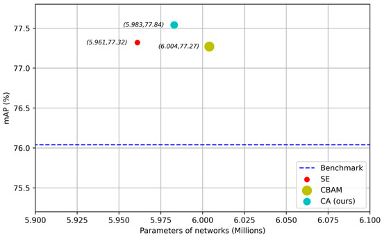 When the Stride is 1, MobileNetv2 Bottleneck optimizes the network using the Inverted Residuals Block to enhance the feature extraction ability of MobileNetv2, a lightweight backbone feature extraction network, and causes the network to adaptively adjust the inter-channel relationship and location information to improve feature extraction. In this paper, the coordinate attention (CA) [18] mechanism proved to be an efficient attention mechanism. To demonstrate its advantages, different attention mechanisms are embedded in the same backbone network and trained and tested on the same dataset. The Pascal VOC [22] test set was used, and the object detection results are shown in Figure 5. When the same lightweight object detector—Yolov4Tiny—was used, the network adding our coordinated attention mechanism CA achieved the highest mAP of 77.54%, which is higher than the results achieved by SE [23], at 77.32% mAP, and CBAM [24], at 77.27% mAP. However, the parameter amount in the CA network was only 5.983 M, which is lower than the 6.004 M achieved by CBAM. Compared with SE, CA only increases the parameter amount by 0.02 M, but increases mAP by 0.22%. Compared with the other two attention mechanisms, SE and CBAM, the CA attention mechanism achieves the best detection at the cost of a small increase in the amount of parameters and is highly competitive. Inspired by this, we inserted this mechanism into the backbone network Mobilenetv2.
