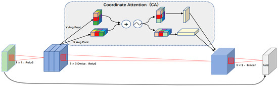 The structure of the Inverted Residuals_CA Block after embedding the Coordinate Attention (CA) mechanism is shown in Figure 6. This can first aggregate features along two spatial directions, and then encode the generated feature maps as a pair of direction-aware and position-sensitive attention maps. These attention maps can be complementarily applied to the input feature map to enhance the representation of the objects of interest and fully extract the feature information of the image.