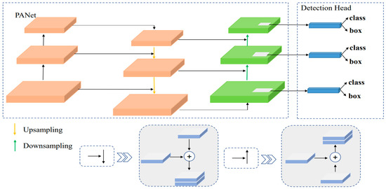 The three different scales of feature layers extracted by the backbone feature extraction network were located in the middle layer, the lower middle layer and the bottom layer. In the feature extraction process, the feature information extracted by the shallow layer network and the deep layer network was different: the shallow layer feature learning was more focused on the location information of the object, while the deep layer feature learning was more focused on the semantic information of the object. To make full use of the feature information contained in the feature maps at different scales, the feature information at different scales, extracted from the seventh, fourteenth and eighteenth layers of the network, was input into PANet network [20] for feature fusion to obtain rich feature information. As shown in Figure 7, in this paper, the PANet network first spliced the features extracted from the 13 × 13 scale of the eighteenth layer of the MobileNetv2_CA backbone network with the Concat tensor, convolved the pooled feature layers several times for upsampling, and spliced them with the features extracted from the 26 × 26 scale of the fourteenth layer of the backbone feature network using the Concat tensor after convolution. After further convolutional processing, another upsampling processing was performed. The features extracted from the 52 × 52 scale of the seventh layer of the backbone network after convolutional processing were spliced using the Concat tensor to create a path incorporating rich location information. Then, the features extracted from the 52 × 52 scale of the seventh layer of the backbone network were downsampled and Concat tensor spliced with the features extracted from the 26 × 26 scale of the fourteenth layer of the backbone network. After convolutional processing, another downsampling process was performed to splice the features extracted from the 13 × 13 scale of the eighteenth layer of the network using the Concat tensor, thus creating a path that incorporates rich semantic information. Finally, the feature fusion network fused deep and shallow feature information to achieve feature enhancement, avoiding the information loss caused by the use of single features.