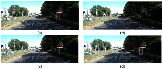 In autonomous driving scenarios, cars, pedestrians and cyclists are the most common detection objects, and it is important to achieve high precision detection on the basis of real-time detection. During object detection, the real-time detection requirement is satisfied when the number of images per second that are processed by the network is more than 30 FPS. Therefore, the requirement of real-time detection can be met. Table 4 shows that that the Faster R-CNN network does not meet the requirements of real-time detection, and the SSD network, although it achieved a faster detection speed, has a detection accuracy that is too low to meet the requirements of high-precision detection. Both the YOLOv3 network and the MobileNetv2_CA network in this paper can achieve real-time and high-precision detection. Therefore, the detection precision of the two networks are further compared in Table 5, using the KITTI validation set and three different evaluation criteria. It can be seen that, under the three different criteria, the proposed network has a 2.25%, 1.38% and 0.9% higher detection precision than the YOLOv3 in the car class. The precision of pedestrian detection is 8.8%, 7.65% and 0.8% higher than that of YOLOv3, respectively. The detection precision of cyclists is 0.95%, 0.53% and 0.88% higher than that of YOLOv3, respectively. In conclusion, the detection precision of all the networks in this paper is better than that of the YOLOv3 network, and the number of parameters is only 63.58% of that of the YOLOv3 network. Although the FPS is slightly lower than that of the YOLOv3 network, because the Coordinate Attention (CA) mechanism added in this paper takes time to extract rich features, the detection precision of this network is higher if the real-time detection FPS is greater than 30 FPS. A scheme combining a better detection speed and precision was achieved under the premise of ensuring a lightweight network.