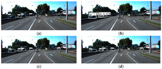 To reduce the network’s demand for device memory during feature extraction, and to enhance the feature extraction of small object scenes and multiple complex scenes, a novel Mosaic image enhancement method inspired by Yolov4 [21] was used in the data pre-processing stage. We experimentally determined the optimal scaling factor, original image warping ratio and channel warping for KITTI images. Scale represents the scaling ratio of the original image, which was set between 0.25 and 2 in this article. The jitter represents the distortion ratio of the width and height of the original image. In this article, we set jitter = 0.3, which means the distortion was between 0.7/1.3 (0.538) and 1.3/0.7 (1.857). Hue = 0.1, sat = 0.5 and val = 0.5, which represent the distortion of the three channels in the hsv color gamut, namely, hue (H), saturation (S) and lightness (V), respectively. These hyperparameters are related to image size, object class and density. The distribution of small object scenes and complex scenes in datasets was generally uneven, which meant that the learning of small objects and complex scenes in the training process was always less than adequate. By using the Mosaic image enhancement method, the possibility of obtaining multiple complex scenes and small object scenes after traversing four images greatly increases, which helps the network to accurately detect small objects and multiple complex scene targets by learning object features during the training process. The test results are shown in Figure 2.