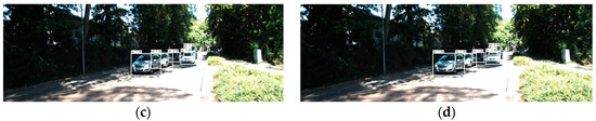 Figure 3a shows the effect of data enhancement for small object scenes, and the small object in the distance was successfully captured. Figure 3b shows the effect of data enhancement for obscured objects and objects in low-light-state scenes, and the object in an obscured and low-light state was successfully captured. Figure 3c is the detection effect diagram of our model with Mosaic data enhancement turned off, and Figure 3d is the detection effect diagram of our model with Mosaic data enhancement turned on, which confirms that, if there is no data enhancement of the images, the detector will suffer from missed detections.