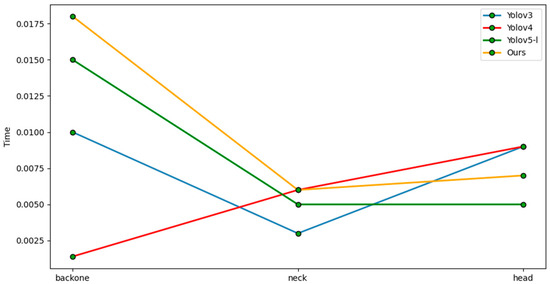 After comprehensively weighing the detection accuracy and the number of network parameters, our method could achieve real-time detection. A runtime comparison of each part of various detectors is shown in Figure 11. To show the time-consuming differences between different layers during specific detection tasks in more detail, this paper split and refined the different parts of the model to analyze the runtime. Our model mainly uses the attention mechanism to extract backbone features. This is slightly more time-consuming, but real-time detection is still possible.
