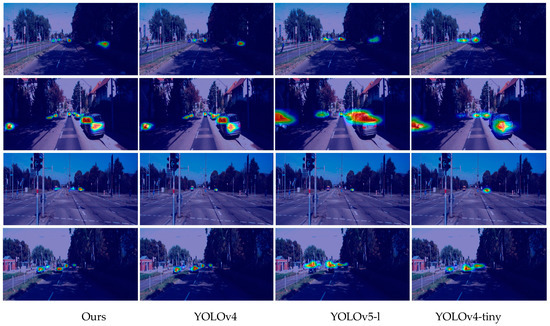 To intuitively reflect the detection performance of this model, some pictures with a complex image environment that are difficult to distinguish were selected from the KITTI test set for detection. Figure 8 shows the small object scene. Figure 8a shows the Faster R-CNN detection effect. Although it can achieve more accurate object detection, its detection speed is too slow to meet the real-time detection requirements. Figure 8b shows the SSD detection effect, which shows a more serious leakage phenomenon and does not detect any object. Figure 8c shows the detection effect of YOLOv3 with some missed detections. Figure 8d shows the detection effect of the network in this paper, which can more comprehensively and accurately detect the emerged objects. Figure 9 shows low-light scenes. Figure 9a shows the Faster R-CNN detection effect in low-light intensity scenes, while the vehicle located on the right side of the scene in the low-light environment was missed. Figure 9b shows the SSD detection effect, where both the vehicle on the right side in the low-light environment and the vehicle on the left side, which belonged to a smaller target, were missed. Figure 9c shows the detection effect of YOLOv3, which contains a high number of parameters despite achieving real-time detection of the target. Figure 9d shows the detection effect of the network in this paper, which can precisely detect both vehicles in the low-light environment as well as vehicles belonging to smaller objects. Figure 10 shows a complex scene containing small objects, occlusion, high light intensity and low light intensity, etc. Figure 10a shows the Faster R-CNN detection effect. Although it can achieve a more accurate target detection, its detection speed is too slow to meet the real-time detection requirements. Figure 10b shows the effect of SSD detection, and the detection phenomenon was missed for vehicles at a low light intensity and rear-obstructed vehicles. Figure 10c shows the detection effect of YOLOv3, which can better detect the object, and Figure 10d shows the detection effect of this network, which can correctly and simultaneously detect all the objects at a low light intensity, high light intensity and obscured objects. In summary, the network used in this paper can quickly and accurately complete detection tasks in different scenarios; therefore, the network proposed in this paper is a real-time object detection network with a light weight and high precision. To more clearly show the difference in the detection results of different models for targets in different KITTI dataset scenes, we visualized the final detection results of different models in a heat map. The first column in Figure 11 shows the detection results of our work. It is clear that our model can accurately locate and detect hard-to-differentiate persons with the right shade in the first scenario, hard-to-differentiate two-vehicle targets with the left shade in the second scenario, and the smaller vehicle in the opposite lane and the vehicle target in the same direction in the third scenario. These scenarios took place in a poor lighting environment. In the fourth scenario, the smaller vehicle in the opposite lane and the vehicle in the same direction were accurately located and detected. This demonstrates the better robustness of our model compared toYOLOv4, YOLOv5, and YOLOv4-tiny in handling autonomous driving scenarios.