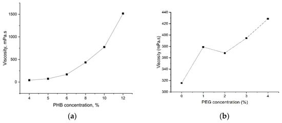 The viscosity of PHB solution (a) and PHB/PEG solution (b).