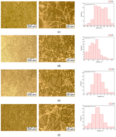 To choose the optimal PHB concentration to mix with PEG, we varied the PHB concentration from 4 to 12% and fixed the electrospinning process specifications as follows: the voltage was set at 30 kV, the distance between the needle tip and collector was 15 cm, the feed rate of the polymer solution was 0.3 mL/h, and there were 18G steel needles. The morphology and distribution of diameter of electrospun PHB fibers are shown in Figure 2.