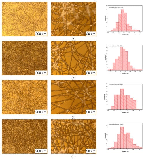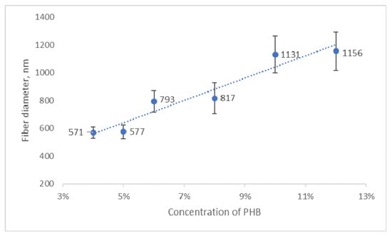Figure 3 shows the average diameter of the obtained fibers. An increase in the concentration of the PHB leads to an increase in the average diameter of the nanofiber while the other parameters remain unchanged. The average diameter of the nanofibers increases from 571 nm to 1156 nm, with an increase in the concentration of PHB from 4% to 12%.
