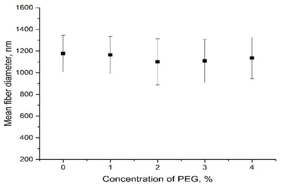 However, with increasing PEG concentration, the diameter of the obtained fiber initially decreased from 1177 nm to 1101 nm, corresponding to 2% PEG, then the diameter of the fiber increased again from 1101 nm to 1136 nm, corresponding to 4% PEG. (Figure 5). This can be explained by the increase in the conductivity of the solution and the surface charge density of the solution jet [34].