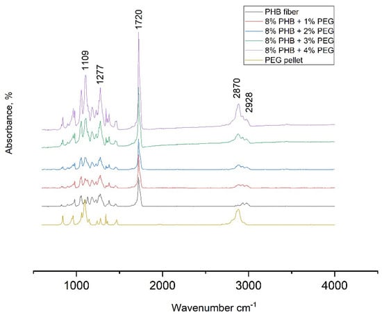 Fourier transform infrared (FTIR) spectra present structural information of material. Figure 6 reveals the spectra in the 600−4000 cm−1 range. The FTIR spectrum for PHB nanofibers mat demonstrated the characteristic absorption bands of 1720 cm−1, which corresponded to C=O stretching vibration, and an accompanying band near 2928 cm−1 was attributed to the methylene C–H vibration. C–H and ether stretching bands of the PEG pellet were detected at 2870 and 1109 cm−1. Many studies have determined the existence of hydrogen bonds between PHB and PEG molecules. Ol’khov et al. [35], based on DSC data, hypothesized that the terminal hydroxyl groups of PEG macromolecules can form hydrogen bonds with PHB chain units. Accordingly, PEG acts as a bridge between PHB molecules. These authors also claim that the terminal OH group of liquid PEG400 is either associated with each other to form a cyclic hydrogen-bonded structure or reacts with the oxygen atoms of oxyethylene units of adjacent chains. H-bond was also detected in some mixtures of PEG with other polymers, such as PVA/PEG [36] and PVP/PEG [37].