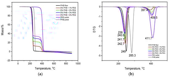 Differential (TGA) and derivative thermogravimetry (DTG) can provide useful information about the thermal stability and degradation of polymer materials. Thermograms of TGA and DTG of the PHB fiber, PEG pellet, and PHB/PEG nanofiber mats with various PEG are demonstrated in Figure 7.