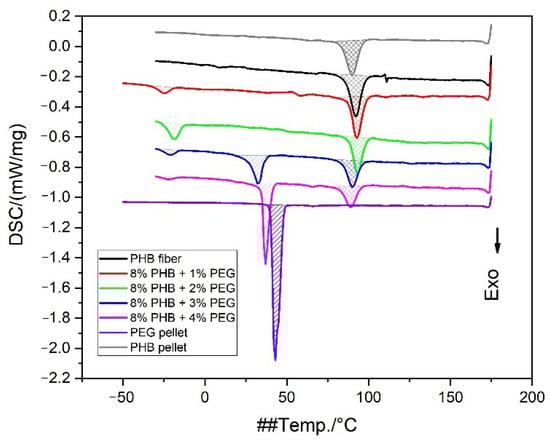 The cooling curves shown in Figure 9 for the PHB/PEG nanofiber mat demonstrate two or three main crystallization events related to PEG and PHB crystallization temperatures. The crystallization temperatures of the PEG pellet are 42.6 °C and PHB 89.8 °C.
