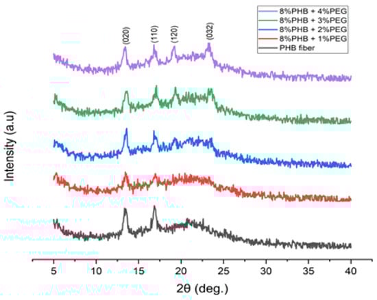 X-ray diffraction (XRD) patterns of the PHB/PEG nanofiber mats are shown in Figure 10. As seen in Figure 10, all samples presented two strong crystalline peaks at 2θ ≈ 13.5° and 17°, which corresponded to the (020) plane and (110) plane of the orthorhombic unit cell of the PHB [30,45]. When adding PEG, two more peaks appear at 2θ ≈ 19° and 2θ ≈ 23°, which correspond to the PEG [45].