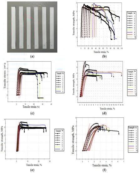 A sample for mechanical testing (a) and PHB/PEG nanofiber mat stress–strain diagrams with a 0% (b), 1% (c), 2% (d), 3% (e), and 4% (f) concentrations of PEG.