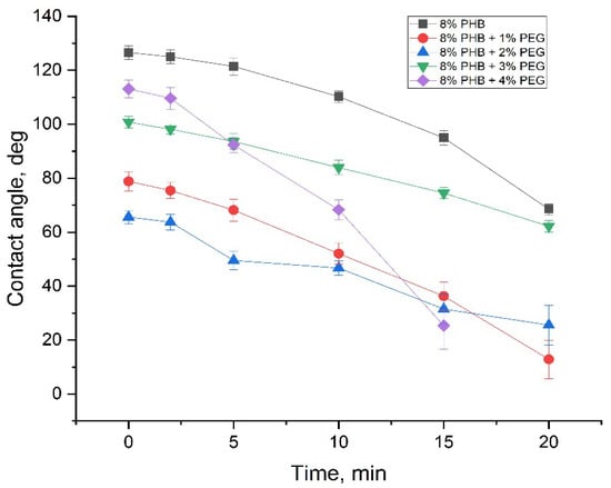 Figure 13 shows the change in contact angle with the time of the PHB/PEG nanofiber mat. The contact angle was measured after 0, 2, 5, 10, 15, and 20 min of water being dropped on the nanofiber mat surface; the contact angle was significantly reduced, and after about 20 min, the water droplets completely penetrated the nanofiber mat surface. This phenomenon occurs due to the PEG dissolution by water.