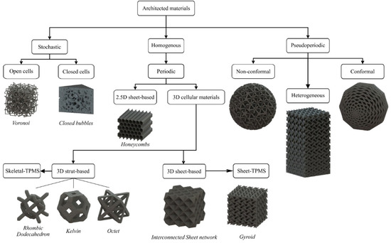 This vast number of architected materials led to the need for classification. According to the existing literature [19,20], there are at least two different types of classification of architected materials based on their geometry and based on their mechanical behavior. However, the most significant classification is geometry-based because it is focused only on the design of the architected material. The architected materials can be classified into three categories based on the periodicity of the structure: stochastic, periodic, and pseudo-periodic. Stochastic lattices can be found in nature or can be designed using random seed functions and algorithms, such as the Voronoi algorithm [21]. Periodic structures have a repeated unit cell in all three dimensions, while pseudo-periodic structures consist of periodic lattices that are interrupted or interactive with the overall structure boundaries, such as conformal structures. Stochastic structures can be further divided into open and closed cell structures and periodic structures into 2.5D (honeycombs, etc.) and 3D lattices [20]. It is important to note that a more in-depth classification of architected materials can be performed at higher levels, resulting in special categories of architected materials such as triply periodic minimal surface structures (TPMS), 3D strut-based structures, and more. A detailed graphical illustration of the basic classification for architected materials, according to the existing literature, can be seen in Figure 1 [19].