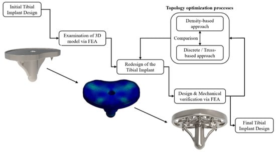 A customized tibial implant for a knee replacement was designed by reverse engineering the DICOM files from the patient’s CT scans. Then, the mechanical performance of the designed tibial implant was evaluated through FEA and the need for TO was highlighted. The tibial was topologically optimized with both approaches and examined in terms of mechanical response through FE analyses under realistic static loads. The outcome of the TO designs for tibial implants were compared in order to identify the most suitable TO approach for biomechanical applications. In particular, a TPMS lattice structure, which was characterized by superior mechanical behavior and higher biocompatibility performance, was employed in a customized tibial implant design, which was derived and designed based on real CT imaging data. A comparison between topology optimization via SIMP and topology optimization is then presented via lattice structures for the same object. Figure 2 depicts the workflow of the current study along with indicative images of the presented case study of the tibial implant.
