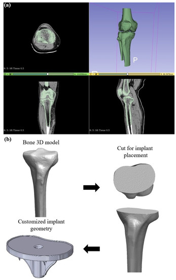 (a) Indicative images from the reconstruction process in 3DSlicer; (b) Workflow of the exportation of customized implant’s geometry.
