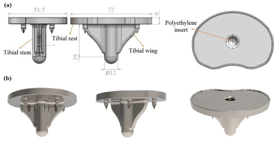 Having the unique geometry of the bone’s cut, the design process for the rest of the implant was performed. More specifically, the stem’s plate was designed according to the patient’s tibia cross-section. Moreover, four symmetric spikes were placed to secure the implant’s placement. In addition, a tibial stem and its corresponding wings were also developed depending on the tibia volume in order to nest inside the bone. Finally, a polyethylene insert was designed to secure the polyethylene part on the implant preventing abrasion between metal components and concurrently providing a smooth operation with the femoral part. Figure 4a illustrates the implant’s regions along with the design and basic dimensions for the developed tibial implant, and Figure 4b depicts rendered images for the designed tibial implant.