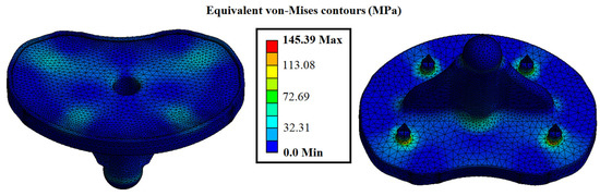 The next step was to set the boundary conditions, such as the fixation areas, and apply the type and value of the load on the model. The loading conditions depended on the weight of the patient (which is 75 kg). In detail, the maximum load derives when intense exercises such as squatting are performed by multiplying the body weight by 7.2 times, resulting in a total force of almost 5300 N [40]. The direction of the applied force was defined as parallel with the vertical axis, and the top surface of the tibial rest was selected as the position of the force application. Regarding the fixation areas, two different types were implemented: displacement and fixed support. The displacement support was inserted on the four spikes of the component with a high friction coefficient (1.2) and fixed support on the end of the implant, constraining any rotations and displacements. After the setup of the finite element model, the analysis was conducted with 10 sub-steps in order to achieve smoother and easier convergence. To conclude, the maximum stresses were spotted around the four spikes where the fixation points were placed and secondary on the base of the tibial stem due to the compressive loads, which are inserted into the bone. The maximum value of the stress at the spikes was observed at 145 MPa and fluctuated in these regions between 145 MPa and 96 MPa. The rest of the regions showed negligible stress concentration, as depicted in Figure 5. It is worth mentioning that the factor of safety (FOS) was 7.58, indicating the necessity of topology optimization, meaning that the current design of the implant could withstand up to 7.58 times the applied loads in order to observe the failure of the structure.