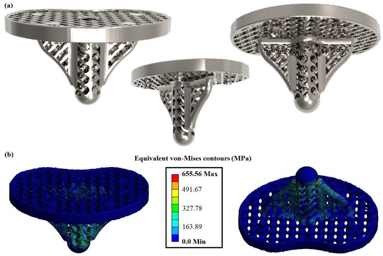 (a) Rendered images of the discrete-based topologically optimized tibial implant; (b) Contours of the discrete-based topologically optimized tibial implant for equivalent von Mises stresses.