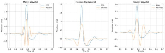We chose the Morlet and Mexican Hat wavelets because of their wide use in the literature considering ECG [24,25,26]. In regard to the Gauss7 wavelet, we chose this one mainly because we could not find works in the literature that had experimented with it before (the one that came close to it ran experiments up to the sixth derivative of the Gaussian function [27]) and also to check the effects that an asymmetric wavelet would have on the ECG signal.