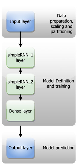 Toward the prediction of energy consumption, we propose an artificial neural network, specifically, an RNN. An RNN is specialized in extracting patterns and making predictions for time series and sequential data. Contrary to a dataset with independent data points, where a feed-forward neural network is the best choice, the existence of data points that depend upon the previous ones, demands the incorporation of a memory concept. This memory provides the prediction model with the capability of storing the previous states and considering them for the prediction of the following output. At the first stage of our pipeline, there is an input layer where the raw data are imported and scaled appropriately to be fed into the hidden layers described previously. The data are scaled in the range (0, 1) and, in turn, divided into train and test sets. After experimentation, we conclude with an 80–20 split, meaning that the train set is the 80% and the test set is the 20% of the whole dataset, respectively. Our network consists of two simpleRNN layers and a dense layer as shown in Figure 3. A simpleRNN layer has a feedback loop that can be unrolled in x time steps as shown in Figure 2 where x is the number of previous observations taken into account for the prediction of the next point.