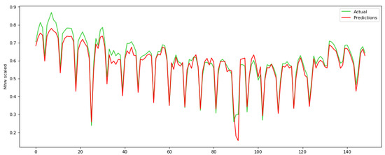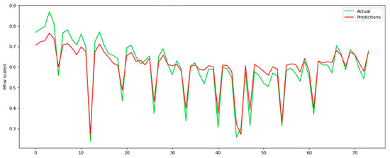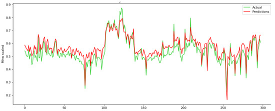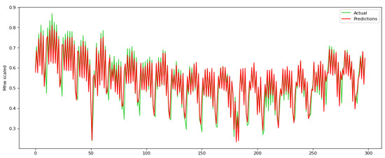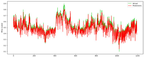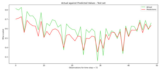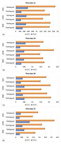 Our experiments show that a time step equal to 24 provides the best results in the test set. Time step equal to 24 results in the least RMSE, illustrating that there is a strong periodicity every 24 h. When the time step is equal to 24, then RMSE = 0.033 in the test set, while for the time step equal to 12 and 48, RMSE is 0.048 and 0.041, respectively. In addition, when the time step is equal to 12, then MAE = 0.163 in the test set, while for the time step equal to 12 and 48 MAE is 0.165 and 0.187, respectively. Subsequently, at a time step of 72, the RNN network demonstrates proficiency within the training set; however, the outcomes within the testing set lack encouragement, indicating an overfitting occurrence within the system. RMSE and MAE in training and test set for all four time steps are shown in Table 2, as well as in Figure 6.