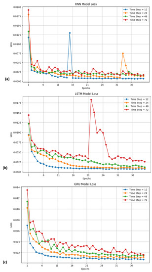 Loss function evolution throughout the training epochs for RNN (a), LSTM (b), GRU (c) for time steps 12, 24, 48, and 72.
