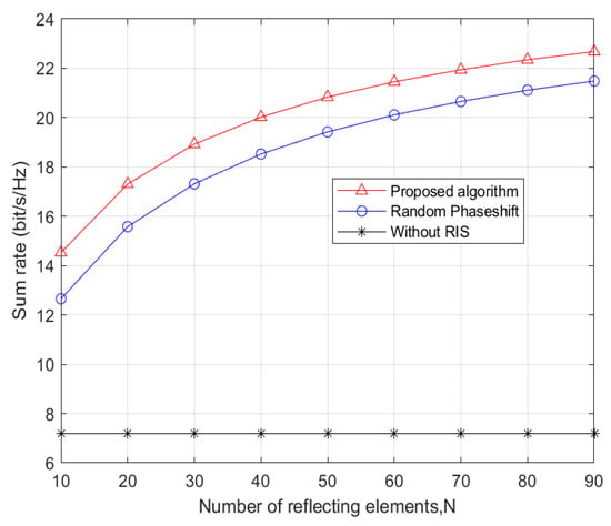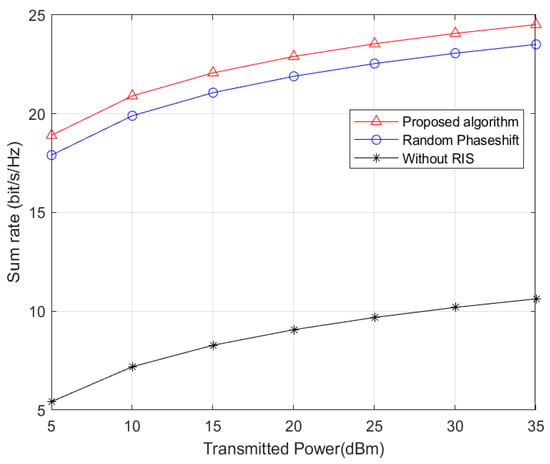 In the scheme without RIS, it is first noted that the total rate drops as the distance increases. This is due to the pathloss that depends on distance. Second, we observed how the network performs with RIS support. As the distance grows, it is shown that the total rate first declines and then increases to achieve an ideal value before decreasing once more. Following is an explanation for this: When the MUE and MBS are close, the MBS’s direct path takes precedence over the reflected path. However, when the distance increases, the reflected path begins to outperform the direct path. We can see at this point that the proposed technique outperforms the random situation. The RCO, in particular, gives a superior solution for phase shift at a distance of 25 m.