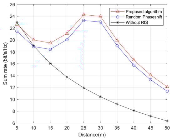 Following that, in Figure 4, we compare the sum rate required by all schemes versus the distance between the MBS and the MUE. Specifically, we alter the distance between MBS and MUE while keeping the placement of the RIS constant and fixing N = 100.