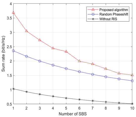 Finally, in Figure 6, we illustrate the overall rate as the number of small base stations (SBSs) increase when the distance between the MBS and the MUE is large and fixed at d = 200 m and the number of RIS elements is also large and fixed at N = 150. In terms of the total rate, the graph illustrates that the proposed scheme outperforms the baseline scheme. Furthermore, when the number of SBSs increase, the network’s performance drops. This is because the number of SBS transmitters has increased. The drop also reflects the fact that passive beamforming at the RIS via a suitable phase shift design can mitigate interference caused by an increase in the number of small base stations (SBSs).