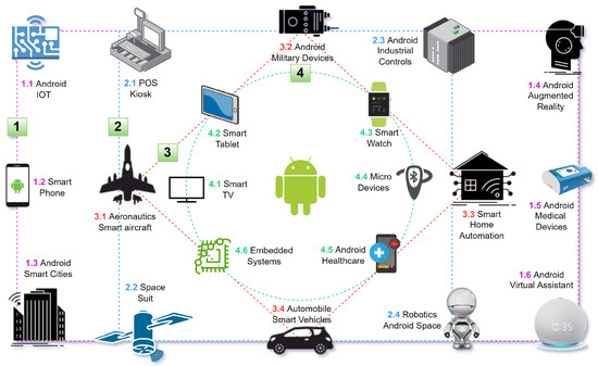 Android is not just limited to smartphones; it has an entire ecosystem. Android ecosystem refers to the collection of hardware, software, and services built around the Android operating system (OS) [42,43]. Many manufacturers use Android OS to power various devices, including smartphones, tablets, smartwatches, televisions, and vehicle infotainment systems [44,45]. These devices come in various sizes, shapes, and capabilities and are manufactured by many different manufacturers [46,47]. Android-based devices are used in several industries, such as retail, healthcare, transportation, and manufacturing [48]. For a better understanding of the Android ecosystem, Figure 1 provides a detailed overview of the list of devices powered by the Android operating system. The figure helps the reader understand the wide range of devices powered by the Android operating system in all major manufacturing industries.