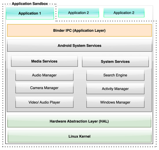 Android architecture is a layered architecture composed of five main components: the application framework, interprocess communication (IPC), system services, hardware abstraction layer (HAL), and the Linux kernel. For a thorough understanding, the illustration of the Android architecture is presented in Figure 2. The figure provides a detailed overview of the different components that stack on top of each other, with the Linux kernel at the bottom, followed by the hardware extraction layer, system services, interprocess communication, and the application framework at the top [55]. This design allows for a separation of duties and helps to ensure security and privacy at the application level.