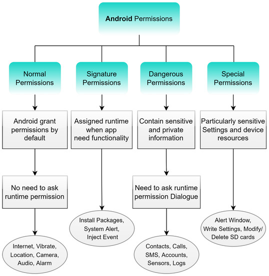 Android is an open source Linux-based operating system (OS) that allows users to manage activities of daily living (ADL) [39]. Android OS is based on security-enhanced Linux (SE-Linux) that emphasizes security controls in the Android infrastructure by maintaining a sophisticated set of rules, Linux policies, and a kernel-level application sandboxing mechanism [40]. Additionally, SE-Linux assigns identification numbers (ID) to users and groups that identify and limit users, processes, and application access to kernel level and hardware attributes [32]. In an ideal scenario, an application works in a dedicated sandbox and cannot interact with other applications and resources until evidenced by a predefined set of permissions or a specific need [41].