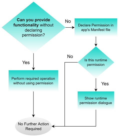 - Dangerous permissions: Dangerous permissions pose a greater risk to user security or privacy. Examples include permissions to access the camera, microphone, or location data [64,65]. When an app requests dangerous permission, the user is presented with a dialog box explaining why the app needs permission, and the user must explicitly grant or deny the permission. Dangerous permissions must be asked for during runtime, and data can only be accessed if the user agrees to allow permission.