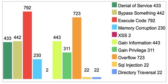 These numbers demonstrate the ongoing challenges the Android OS faces regarding security. Despite the efforts of developers and researchers to improve the security of the Android operating system, the number of vulnerabilities identified continues to increase. Furthermore, these identified vulnerabilities can be divided into various types, such as code execution, buffer overflow, and information gain. This categorization helps identify which types of vulnerabilities are the most popular and occurring. Figure 7 provides details of vulnerabilities by various types. The figure highlights that the most common vulnerabilities that lead to exploitation are code execution and buffer overflow. The details of the reported types of vulnerabilities are as follows: