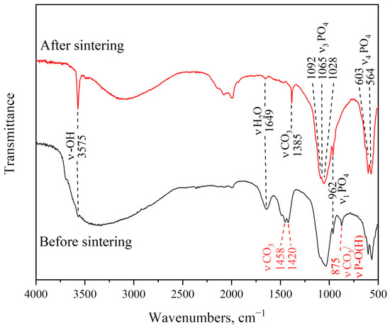 After sintering, a sharp peak of the OH- group appears at 3566 cm−1, indicating an increase in the crystallinity of the samples and the presence of the HA phase. The peaks of the phosphate groups at 960–1100 cm−1 and 550–620 cm−1 remain unchanged. The mode of the hydrophosphate group at 875 cm−1 decreases. The modes belonging to CO32− and adsorbed water also decrease.