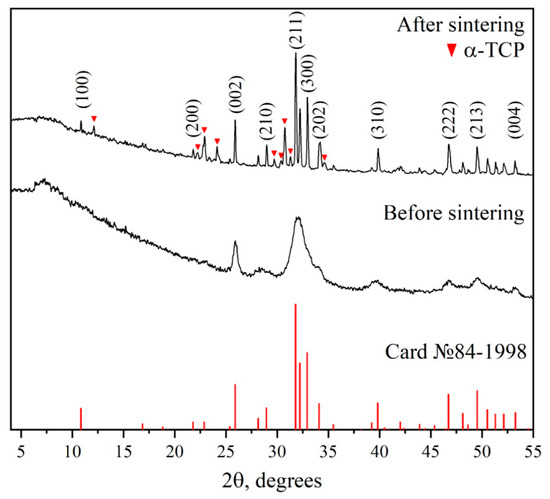 The mass ratios in the final product were calculated by the Chung method (corundum numbers). Samples after sintering contain about 44 ± 2% of the α-TCP phase. The α-TCP phase is not visible in the IR spectrum because the phosphate groups have the same vibration frequencies as in HA []. According to the fact that the HPO43− group (mode at 875 cm−1) was present before annealing, we suggested that initially two phases precipitated from the solution: hydroxyapatite Ca10(PO4)6(OH)2 and calcium-deficient hydroxyapatite (CDHAp) Ca9(HPO4)(PO4)5(OH). The diffraction pattern of CDHAp is presented in card number №46-905. This phase has the same crystal symmetry, space group, and lattice parameters as HA, so it produces reflections that are almost identical to pure HA. However, due to the low crystallinity of our samples, it is not possible to distinguish the phase composition of the precipitate. CDHAp has reflexes with the same Miller indices and at very close angles of two theta as the HA card. Only the intensity differs, but not significantly. Upon heating, CDHAp decomposes into α-TCP and water, according to the mechanism described by Y. Li and et al. []: