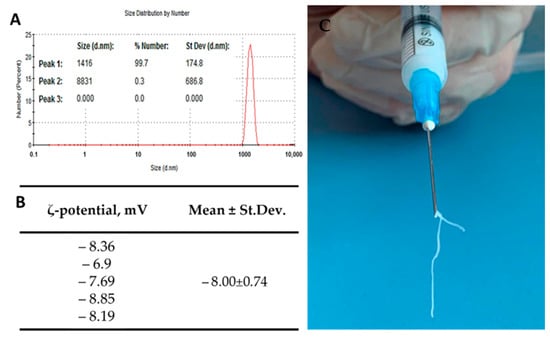 The results of DLS (A) and ζ-potential (B) are presented in Figure 3. As can be seen from the presented data, hCPP was identified as a unimodal narrow-peak dispersed system, with an average particle size of 1416 ± 174.8 nm. Figure 3C presents the data on the high injection capacity of hCPP. The resulting paste-like material easily penetrated through the 23G needle of a standard syringe for subcutaneous and intramuscular injections.