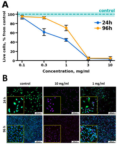 Results of cytotoxic effects of hCPP cultured with murine embryonic mesenchymal cell line C3H/10T1/2 at concentrations of 0.1, 0.3, 1.0, 3.0, and 10.0 mg/mL, after 24 h and 96 h of cultivation (A). Fluorescence microphotographs of cell line C3H/10T1/2 in the control and the presence of 10 mg/mL, 3 mg/mL, and 1 mg/mL hCPP (B): cell nuclei are stained with Hoechst 33342 (blue), the cytoplasm of live cells is stained with calcein AM (green), and nuclei of dead cells are stained with PI (purple).