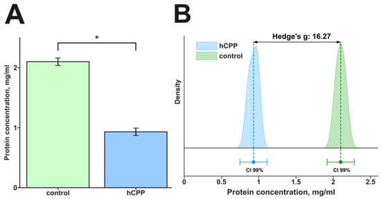 Results of protein adsorption of hCPP (10 mg/mL) cultured with PBS + 10% FBS (A). Effect size is shown using the standardized mean difference (Hedges’s g). Hedges’s coefficient g ≥ 0.80 indicates a large effect (B). *—statistically significant difference compared to control, p < 0.05. CI—confidence interval.
