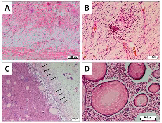 Histological analysis of injected hCPP samples in the control (A,B) and experimental (C,D) groups after three weeks of implantation. Hematoxylin and eosin staining (H&E, cell nuclei colored blue, erythrocytes colored red, and muscle tissue colored pink; black arrows—mature microvessels in neocollagen capsule); light microscopy. Explanations in the text.