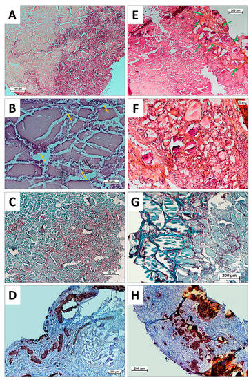Histological analysis of injected hCPP samples after six (A–D) and thirteen (E–G) weeks. (A,B,E,F) Hematoxylin and eosin staining (H&E, cell nuclei colored blue, erythrocytes colored red, and muscle tissue colored pink; yellow arrows—cells migrated into the cracked calcium phosphate-protein substrate; green arrows—neocollagen trabecula-like matrix); (C,G) Masson–Goldner staining (cell nuclei colored purpuric, neocollagen matrix colored turquoise, calcium-protein deposits colored pale blue); (D,H) alizarin red S staining (calcium deposits colored orange-red, cell nuclei colored dark blue); light microscopy. Explanations in the text.