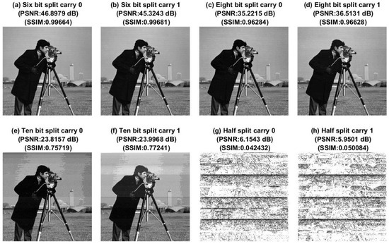From Figure 2, it is evident that the splitting up of a VRPR adder into two equal parts, as suggested in [13], is not universally suitable for practical applications, as demonstrated here in the case of DIP. Therefore, a functional unit, according to VRPR, must be split commensurate with a target application. To substantiate this observation, we considered splitting up a VRPR adder into two adder parts of different sizes and then repeating the DIP discussed previously. The results of the repeated experimentation are shown in Figure 3 for an example image (cameraman).