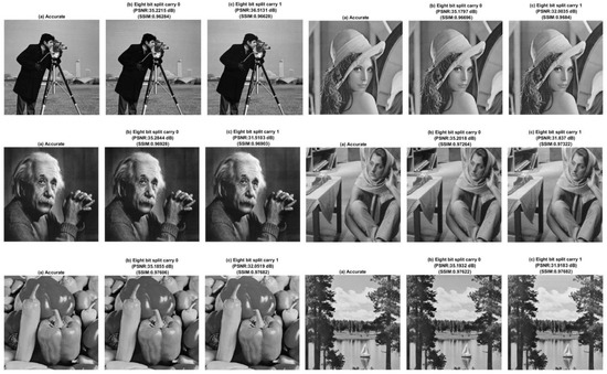 Example digital images processed using a VRPR adder. In each image, “(a) Accurate” corresponds to a VRPR adder with no SBU of the internal carry input, and “(b) Half split carry 0” and “(c) Half split carry 1” imply that a 32-bit VRPR adder was split into two equal parts as suggested in [13] (implying ‘half split’), with the carry input to the significant 16-bit adder part stuck at 0 and 1, respectively, due to a radiation impact representing an SBU. Thus, if the internal carry input of an equally partitioned VRPR adder is affected either way due to an SBU, it is found to result in the corruption of images.