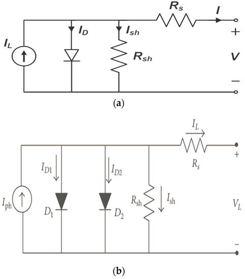 (a) Single diode model of PV cell. (b) Double diode model of PV cell [66,68].