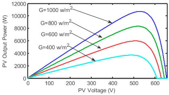 P–V characteristic of a PV array at constant temperature and variable solar irradiation [66,68].
