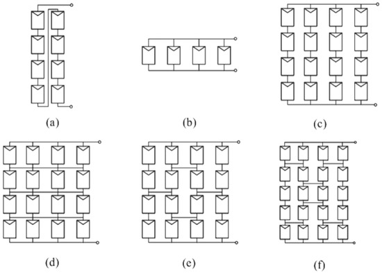 PV array configuration structures: (a) Simple Series (SS); (b) Parallel; (c) Series–Parallel; (d) Total Cross Tie; (e) Bridge Link; and (f) Honey Comb [67].